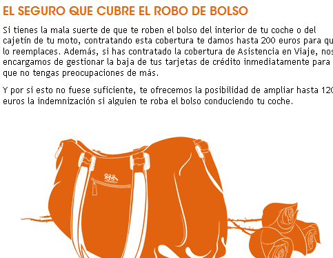 Osti tu, si que es un poco para mujeres. Que no lo veo mal, pero luego dicen que somos machistas. Estos servicios los tendría que dar cualquier seguro, y efectivamente cubrir el robo de bolso, bolsa, mochila o lo que sea. Por ser mujer no tienen porque llevar bolso.